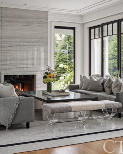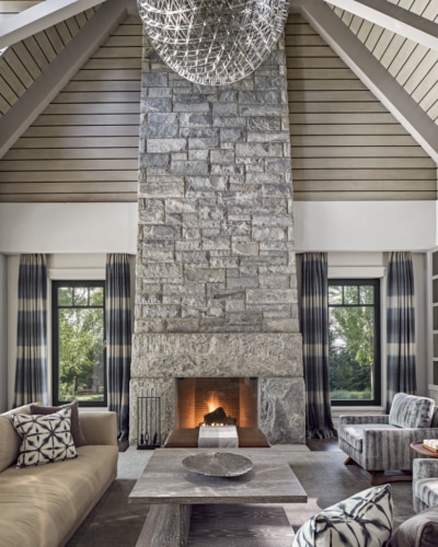 This grand shingle-style home designed by Shope Reno Wharton is built on three acres overlooking Long Island Sound. The great room boasts a two-story fieldstone fireplace and vaulted ceilings with shiplap wainscoting. The more than 13,000 square feet features seven ensuite bedrooms and doesn’t include the lower level billiards room, home gym, home theater and game room. A perfectly sited infinity pool and pool house tops off this estate.